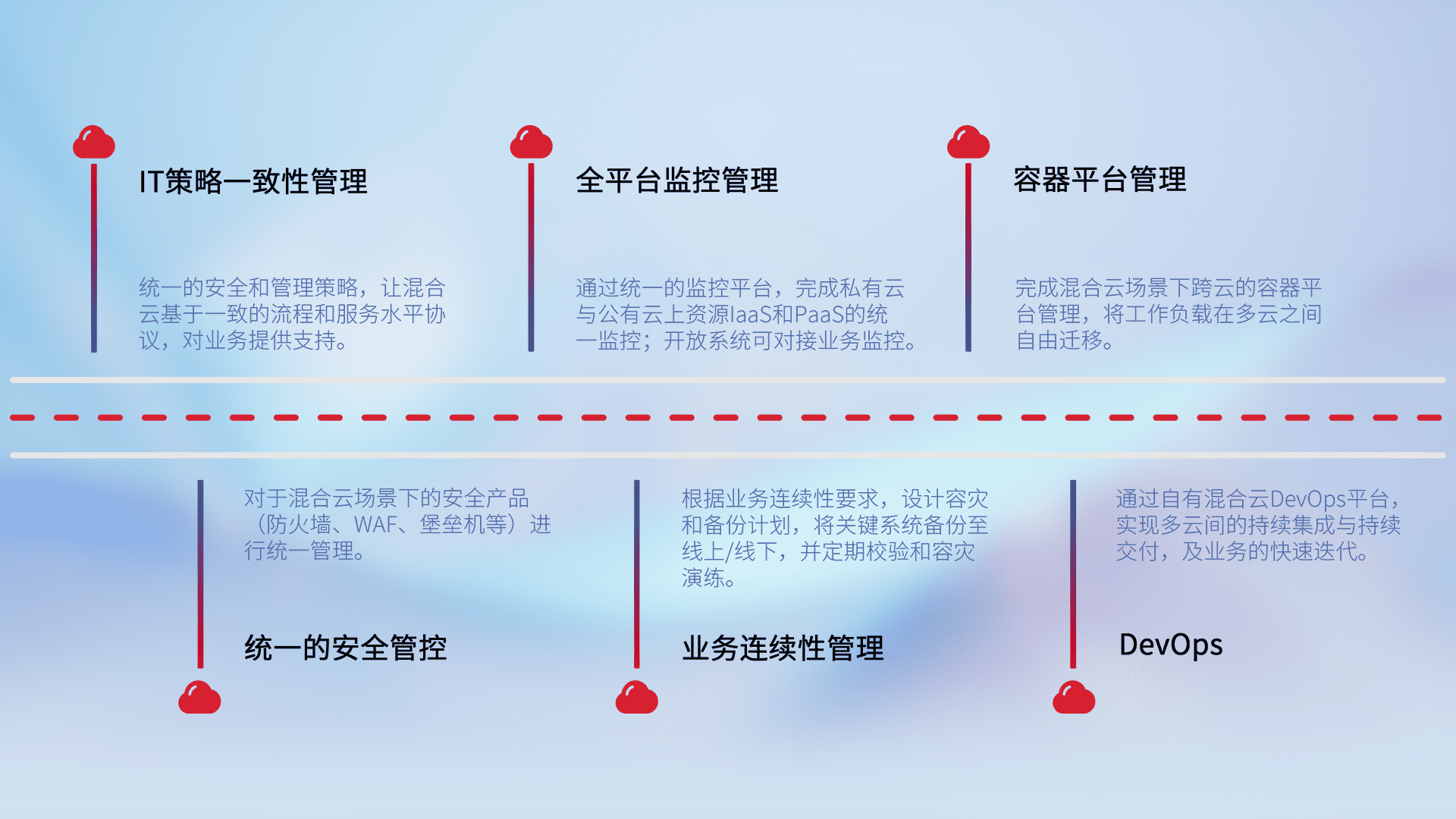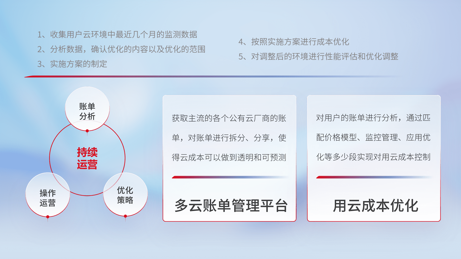 通过多云纳管,,,,以统一的资源数据模型把客户的云资源进行抽象和封装,,,,进而实现对多云资源的统一操作,,,,保障云资源管理的可靠性、、、稳定性与可用性。。。量身定制化运维内容,,,,配置、、、、开发运维、、补丁管理、、备份、、、监控、、、、认证和访问管理、、、审计和日常巡检等,,保障在用云过程中的可靠度,,,,稳定度以及高可用率。。。。