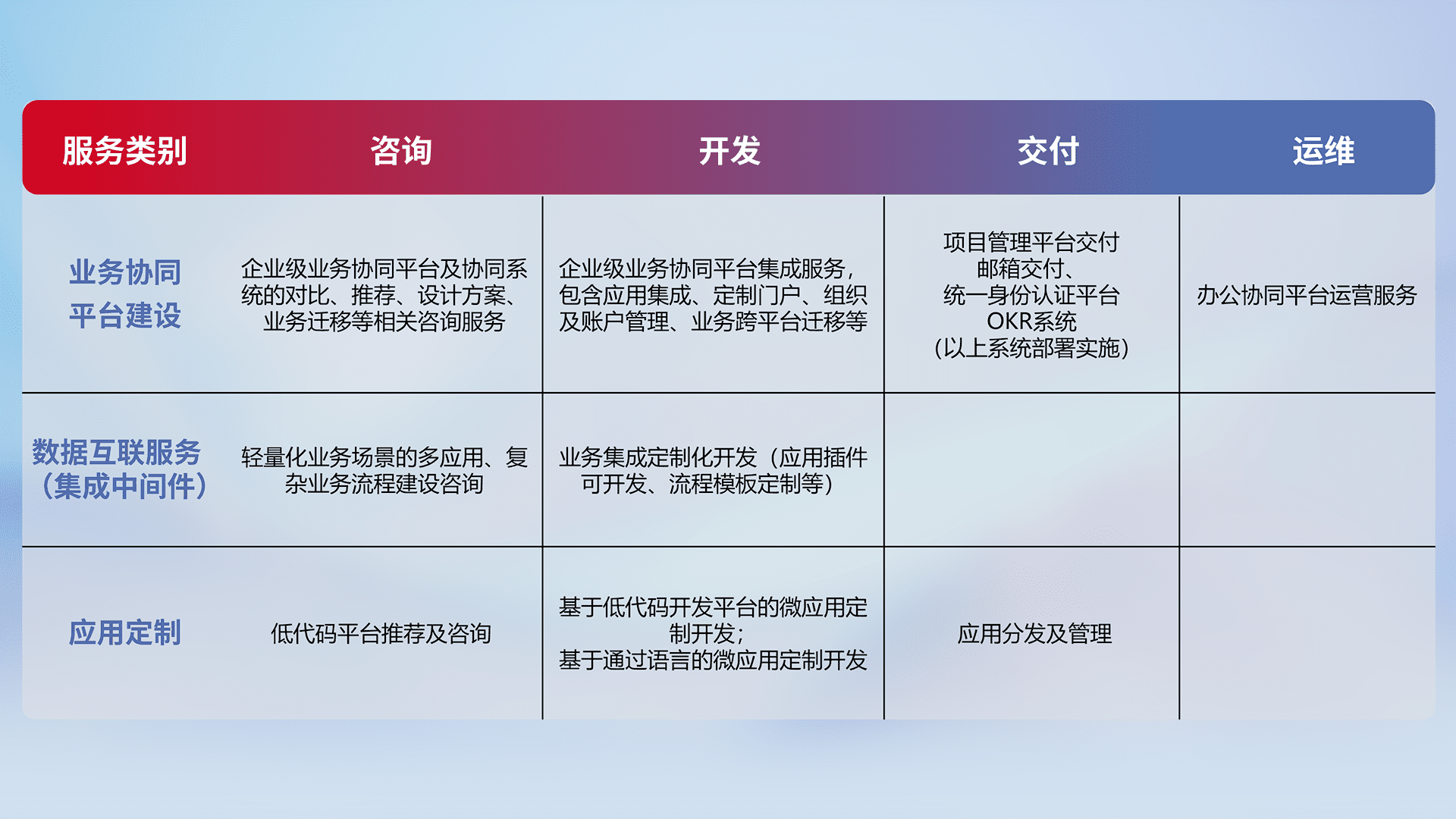 针对钉钉、、、、企微、、、IDaas等平台级产品提供产品的规划、、、、方案、、交付、、、定制化开发等服务,,实现如统一协同办公、、智能客户服务、、混合会议管理、、、智能数据查询、、等业务场景,,,实现数字化转型。。